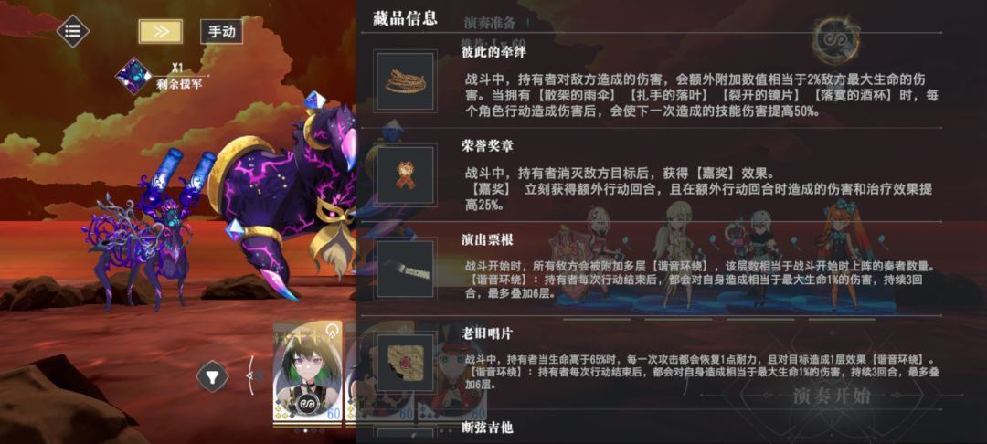 下面详述一下过关重点——核心想法就是多开路线中的宝箱(火山一共8个宝箱,本人一次过没有重来过,开出6个),多拿藏品,图7、8、9所示为本人通关时携带藏品:1:荣誉奖章(清小怪无敌中的无敌:击杀获得额外回合并加伤害治疗);2.彼此的牵绊(攻击额外附带2%生命值上限,聊胜于无);3.演出票根(战斗开始敌方全员附加4层“谐音环绕”:敌方每次行动损失1%×层数最大生命值,最多6层)+老旧唱片(我方每次攻击给目标上一层“谐音环绕”)+断弦吉他(我方每次攻击目标损失3%×层数最大生命值,注意:每次触发被动不会掉被动层数)+歌词手稿(“谐音环绕目标”受伤提高25%,聊胜于无)