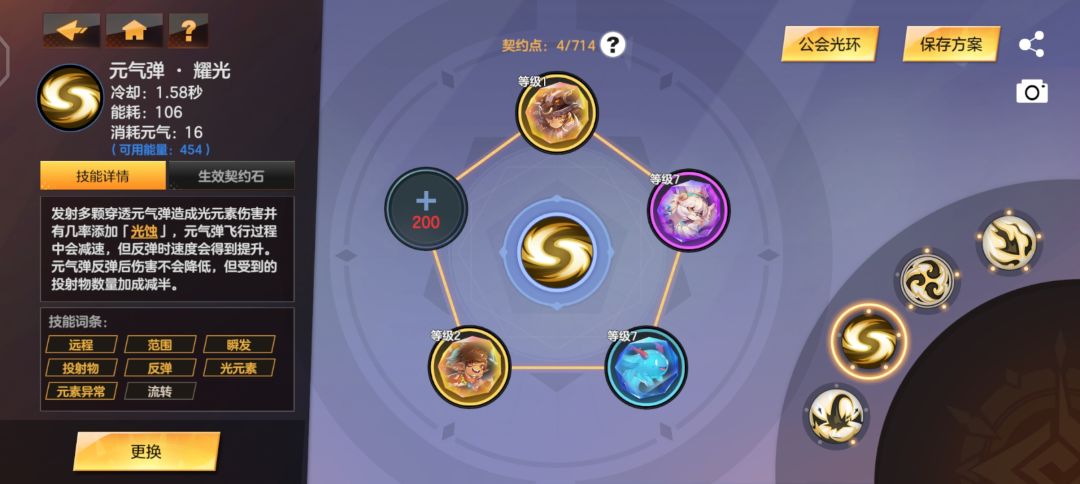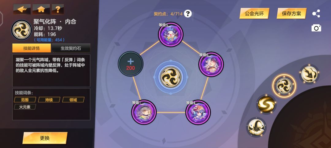 三技能聚气化阵-加个一级的【节能守护】,开了二技能回能不够了,公会光环回能升到10级左右应该就不用这个了。