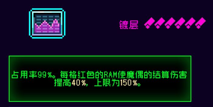 (6)六号位双倍内存,这玩意也算是对噪音作为毒属性专属角色的一种补贴方式,带满毒六件套的满级噪音拥有八个RAM,但这显然还没加成到这件纪念品的上限,而老牌纪念品毒苹果正是补完残缺一角的最后一块拼图,满镀后非独立乘区百分之200的魔偶结算伤害,中规中矩。什么,你问我为什么不带伤害加成独立乘区的数据银行?
