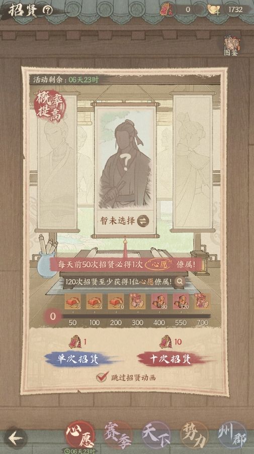 【心愿招贤福利】每日前50次招贤必得1次[心愿]僚属,120次招贤必得1次[心愿]僚属;