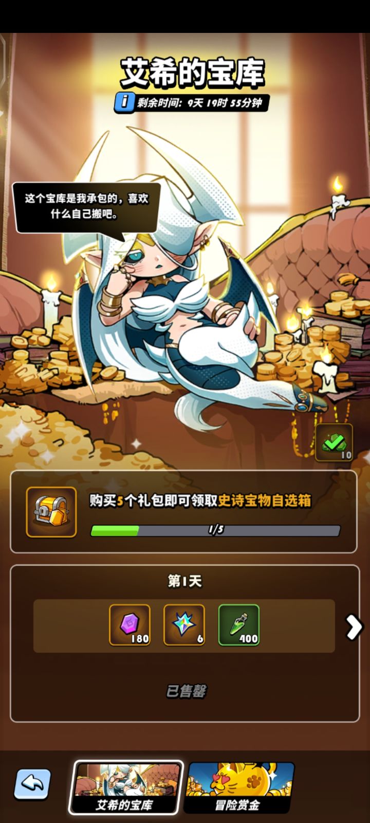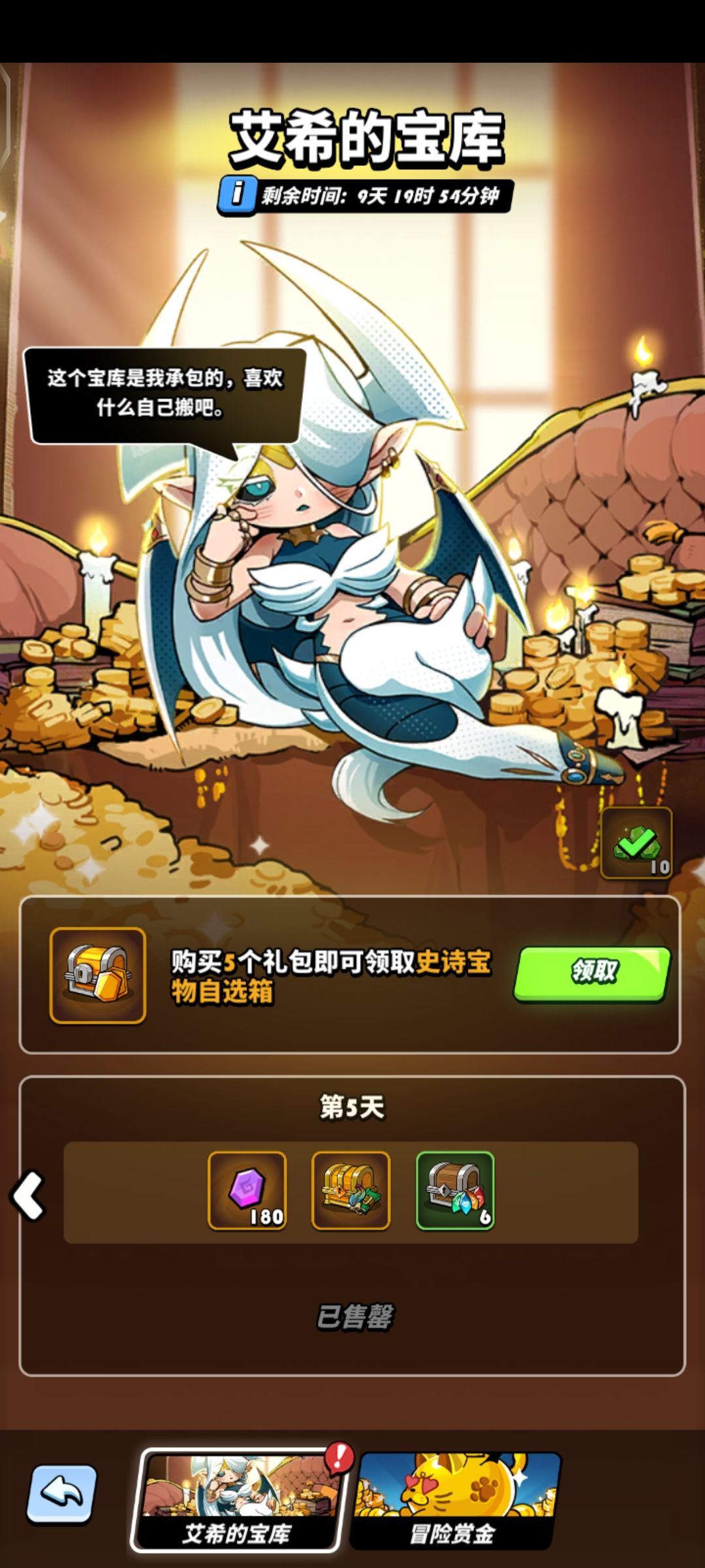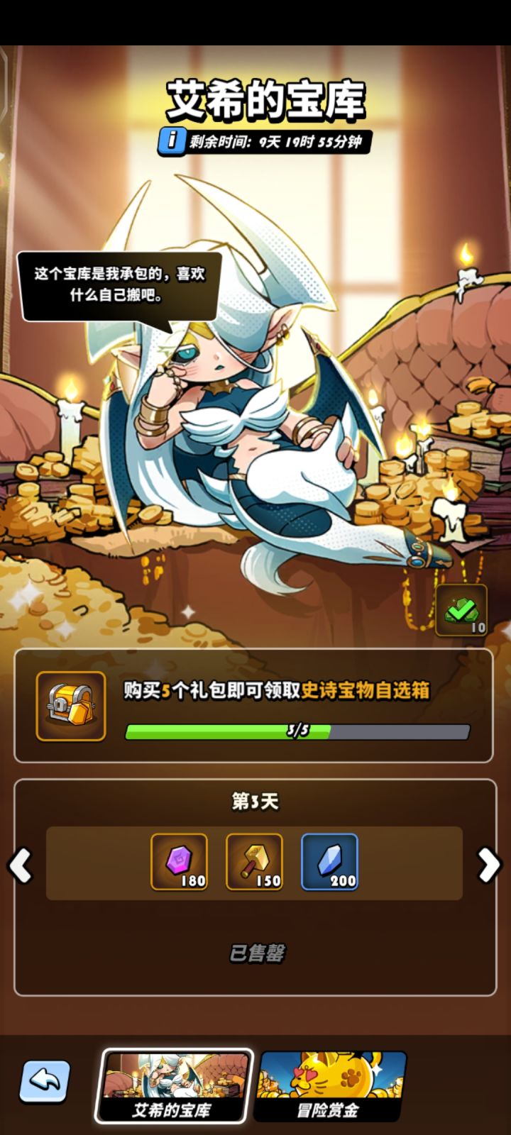 然后这是买完后几天的奖励如下几图,我也不废话了直接说结论:对于微氪来说氪金重点多在获取宝石,这个活动对于大部分微氪党来说不是很值,5天后送的自选宝箱都是sr龙的宝物,没啥大用,纯纯欺骗萌新,买宝石效率还不如商城里6块3个粉钻的礼包,推荐度次于金猪月卡通行证和大部分商城小礼包;对于中高氪玩家来说还算可以,这个宝库里的道具对战力还是有增幅的,就那周本固定产出的石头和锤子都值得一氪。