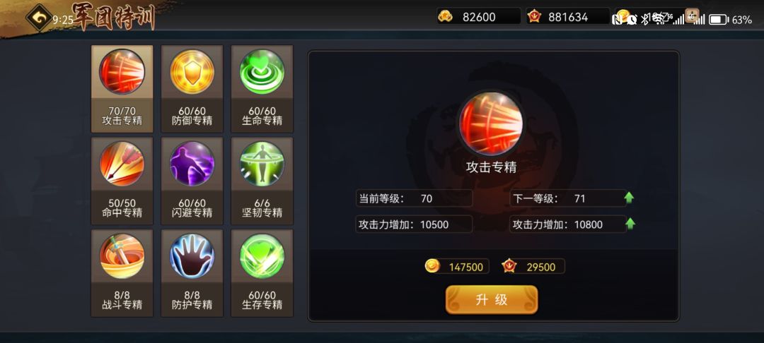建议粮饷优先提升议事堂等级,接下来再考虑军团特训技能的提升,三大基础属性专精技能当然是最优先级了。