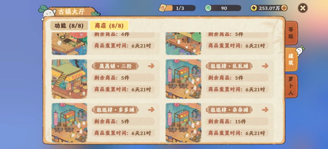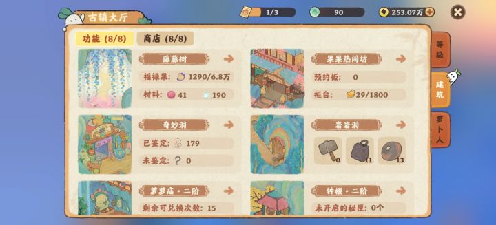然后,主体功能方面。热闹坊,建议萌新先开地,学堂里学习不摆放就加舒适度之后,再来升级。之后热度4000+,逐步可以集齐五湖四海的萝,就可以先停了。寺庙建议修复,这样手里不平均的材料,可以交换,便于合理利用。其他可以暂缓,后续铜钱富余再说。商店方面修复一个逛逛肆,因为此地同时有3个商铺,且其中一个卖材料,性价比高。