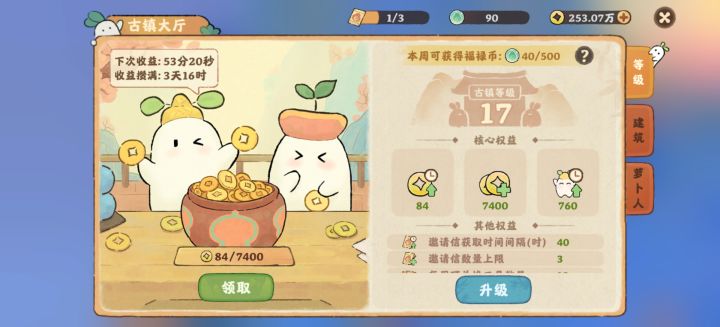 首先,等级到了一定优先开放古镇。然后到图一的大厅,可以查看古镇的所有功能。大厅里可以定时领取铜币,略胜于无,还有定时会有邀请信,邀请工坊的萝,可增加10%的双倍产出机会。