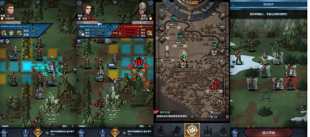 第三关:回防村落(战前准备及走位大致如上图所示),注意我们的角色最好不要两个人横向紧邻,这样有时友方村民无法前进。完成后,开启第四关:保护村民,战前准备如上图所示