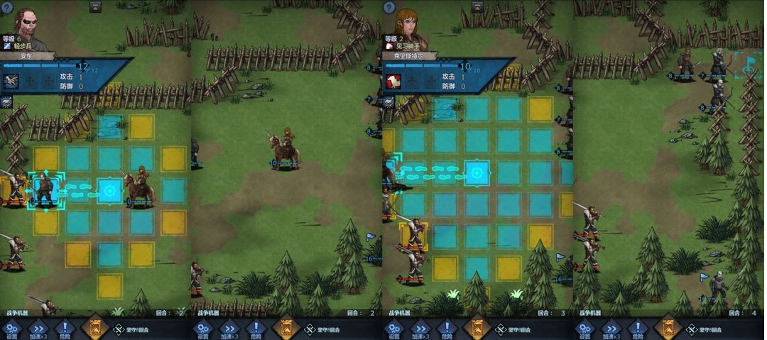 回合2:见习骑手左侧工具人向左前进2格,不要攻击,见习骑手原地不动,右侧上方三人均向上前进两格,下方一人向下进入草丛