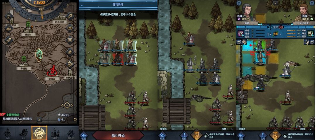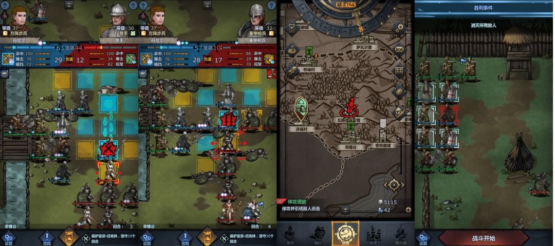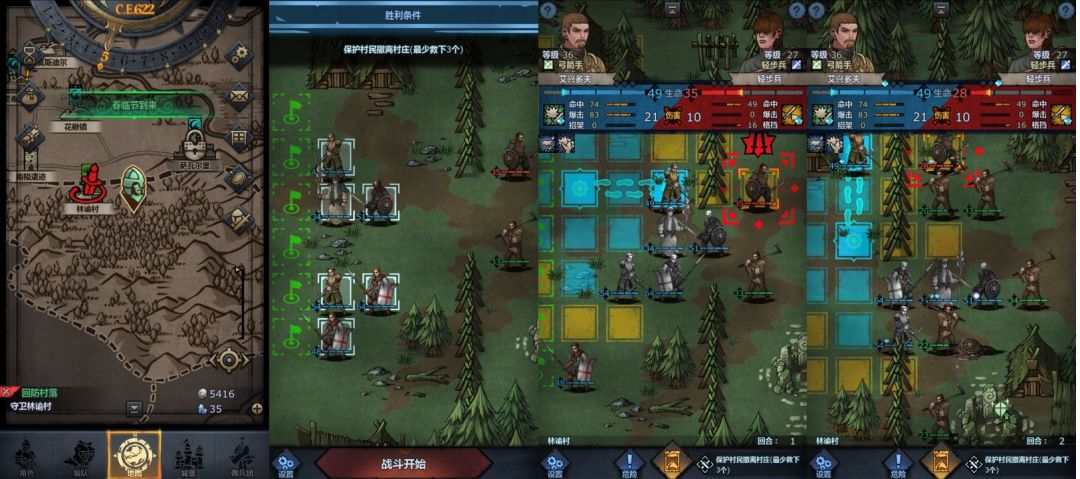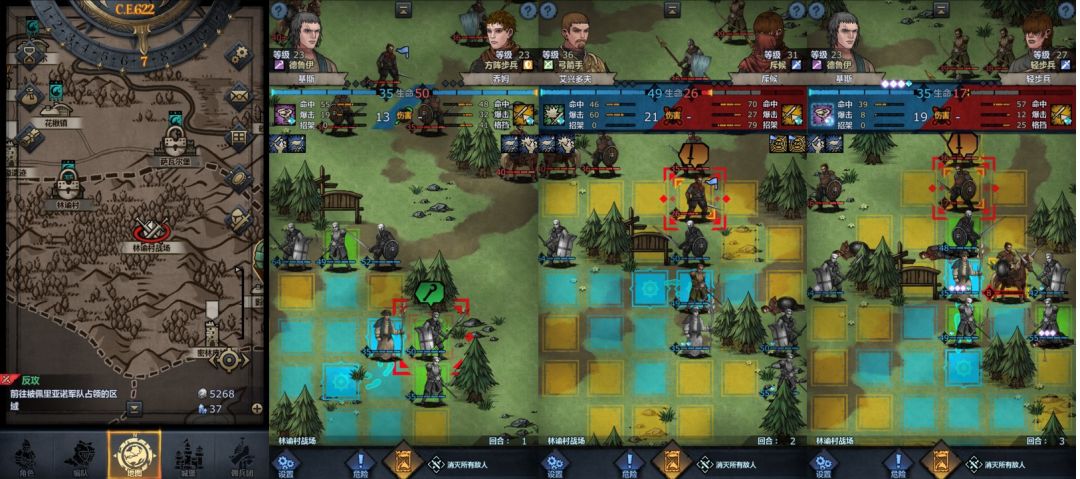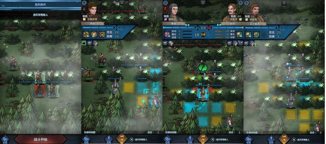 回合3:布兰顿向左前进两格攻击下方弩手(若暴击干掉敌人则重来,理由见下方),普雷斯科特向左前进一格并攻击身前弩手,艾丹向左前进一格并攻击身前近战,老骑士向右上方前进至图中位置,乔姆向下进入草丛,主角向左上方进入草丛,小公主原地不动