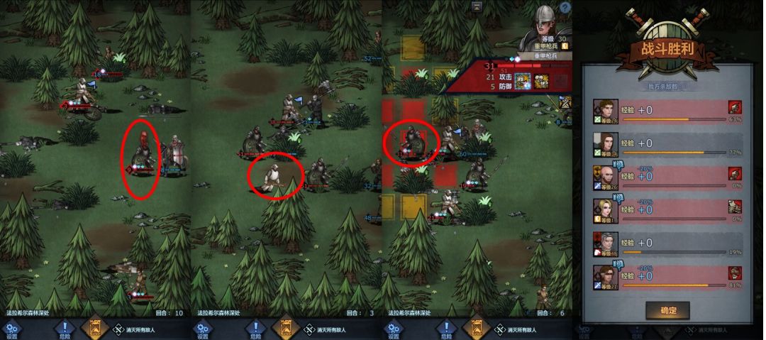 第十关:佯攻诱敌(战前准备及走位大致如上图所示),注意本关虽然在第3回合后为撤退关卡,但我们现在的阵容厚度可以消灭全部敌人,采用图上走位方式可以拿到大部分经验,最后经验情况如右图所示。
