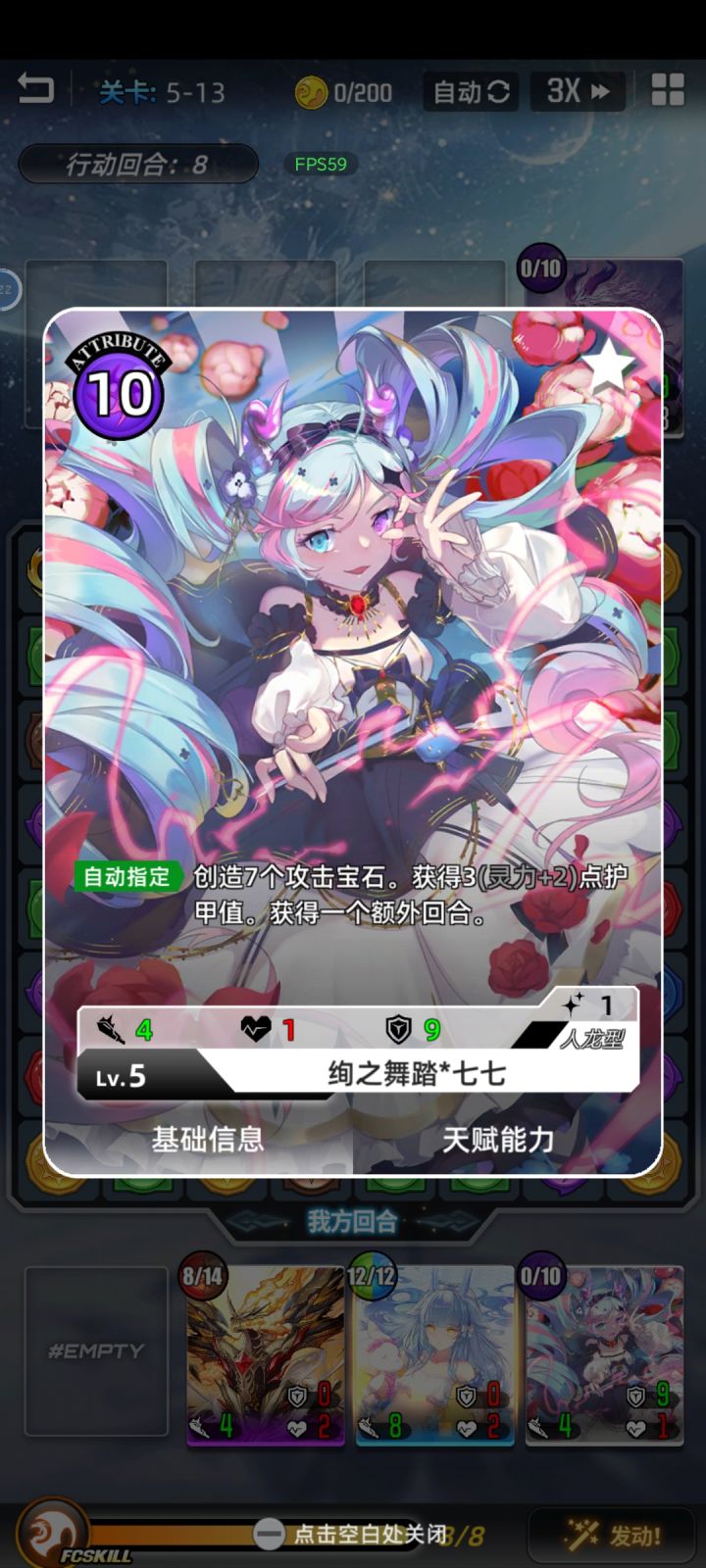 释放她的技能,除了攻击敌人,还会制造七颗火属性宝石,如果有机会的话她释放完第一次技能时她的匹配宝石会充满,这样可以紧接着再释放一次技能,也有机会她的匹配宝石会再次充满,然后就可以再一次紧接着释放技能。我最高次记录是连续释放三次技能,不知道还会更高吗?