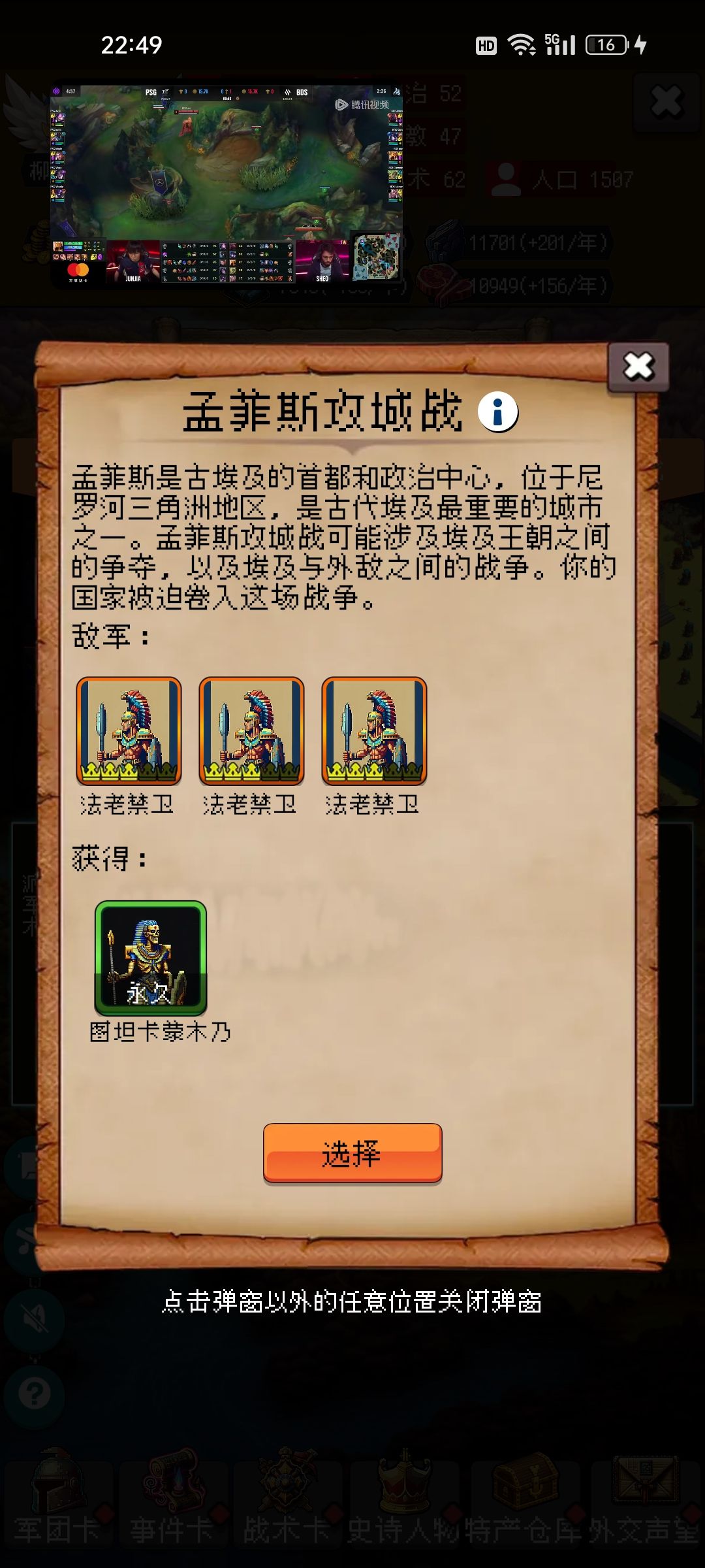 5.孟菲斯攻城战(征服古埃及的条件之一)奖励:图坦卡蒙木乃伊(永久绿色人物:人口+4 弓兵吸取+2%)