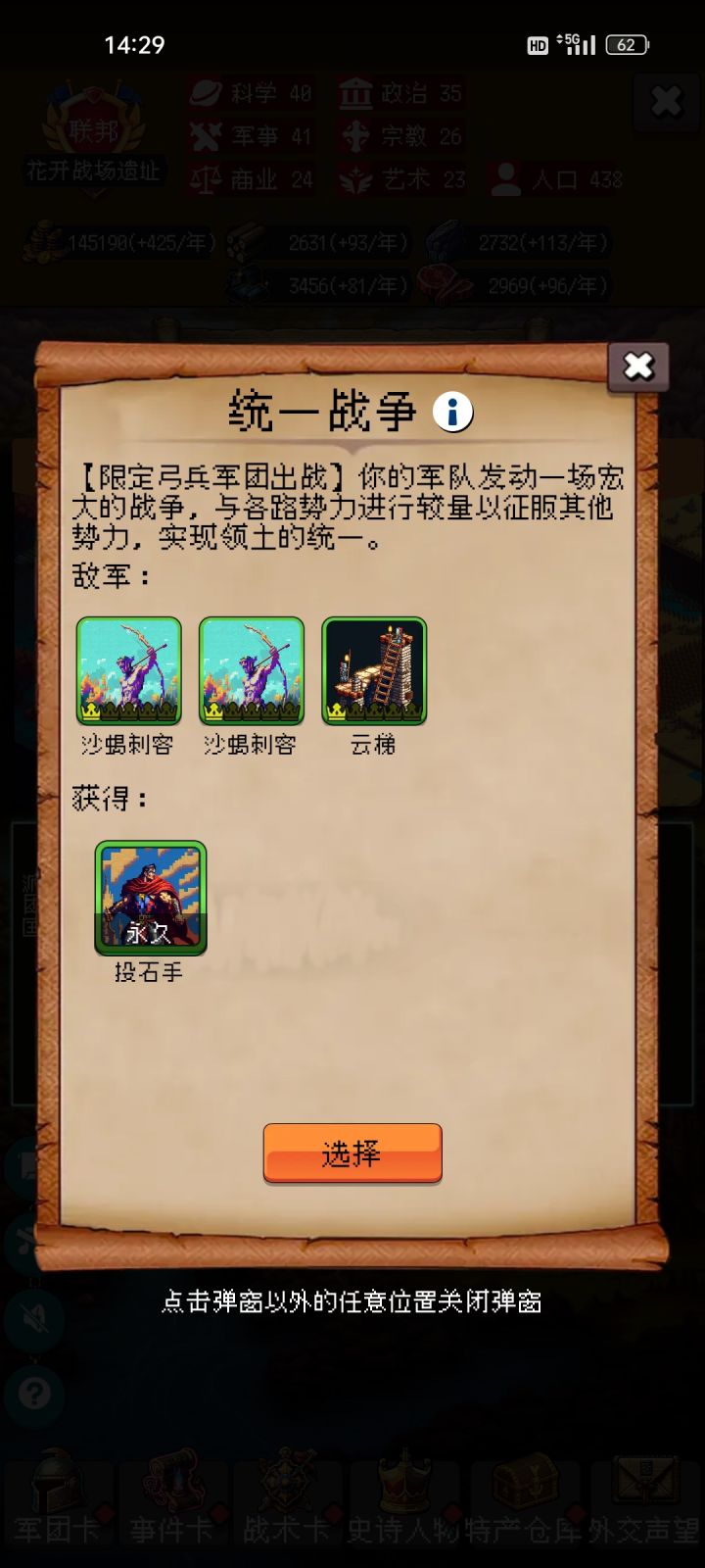 1.统一战争(限弓兵军团出战) 奖励:投石手(永久绿色军团卡:主动50%对敌方单体造成3次100%远程伤害 每次目标随机 冷却2回合 )