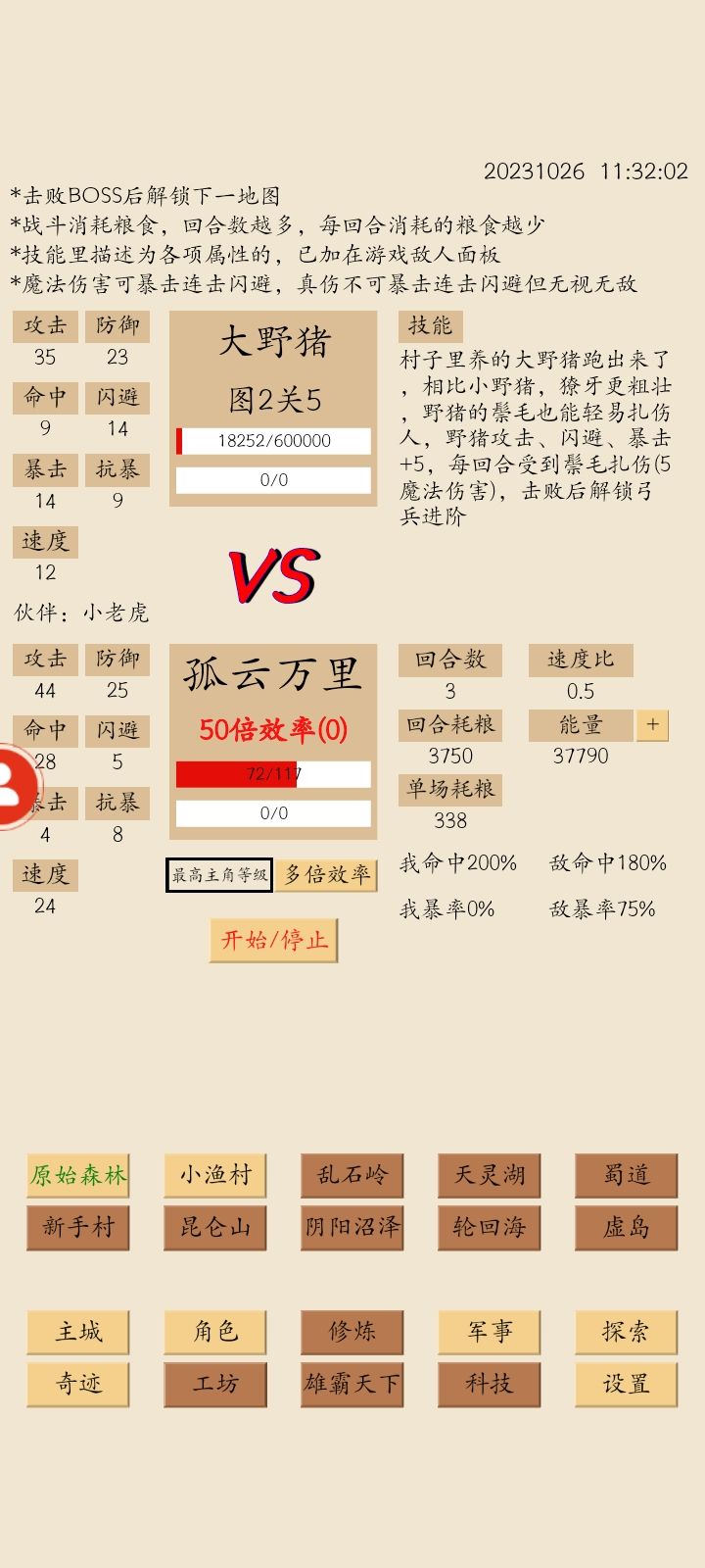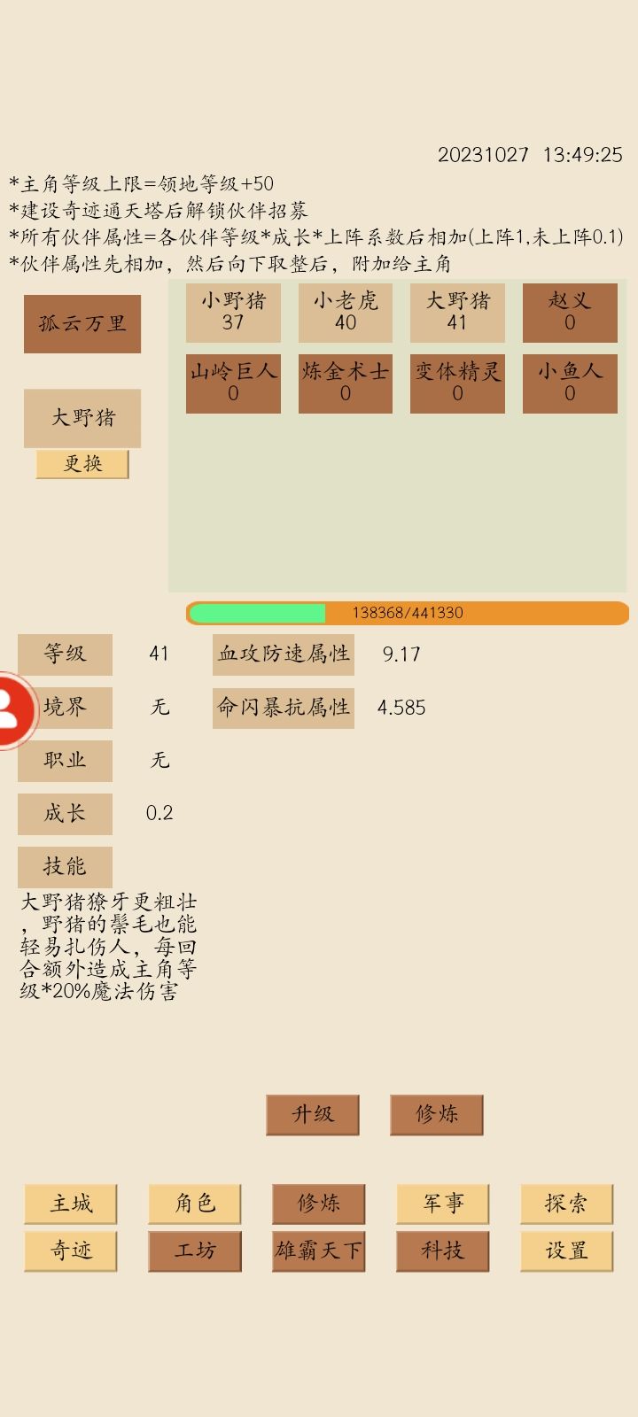 等级50,改了房子,打了大野猪,优先木头50级,粮食50级,石矿36级,存100木200石头建通天塔2层,招了大野猪,把它升到50级,然后准备攻克赵义,过了赵义出科技,学院,这是目前游戏收益最大的BOSS,越早过越好,过了之后再下调粮食。招了大野猪之后,有声望可以招小野猪,加声望产量的,早招早回本,之后的声望出弓兵,过炼金术士之前,都是声望都是主弓兵,过了炼金再平均升级,1,11,21,这样出,因为产量向上取整。