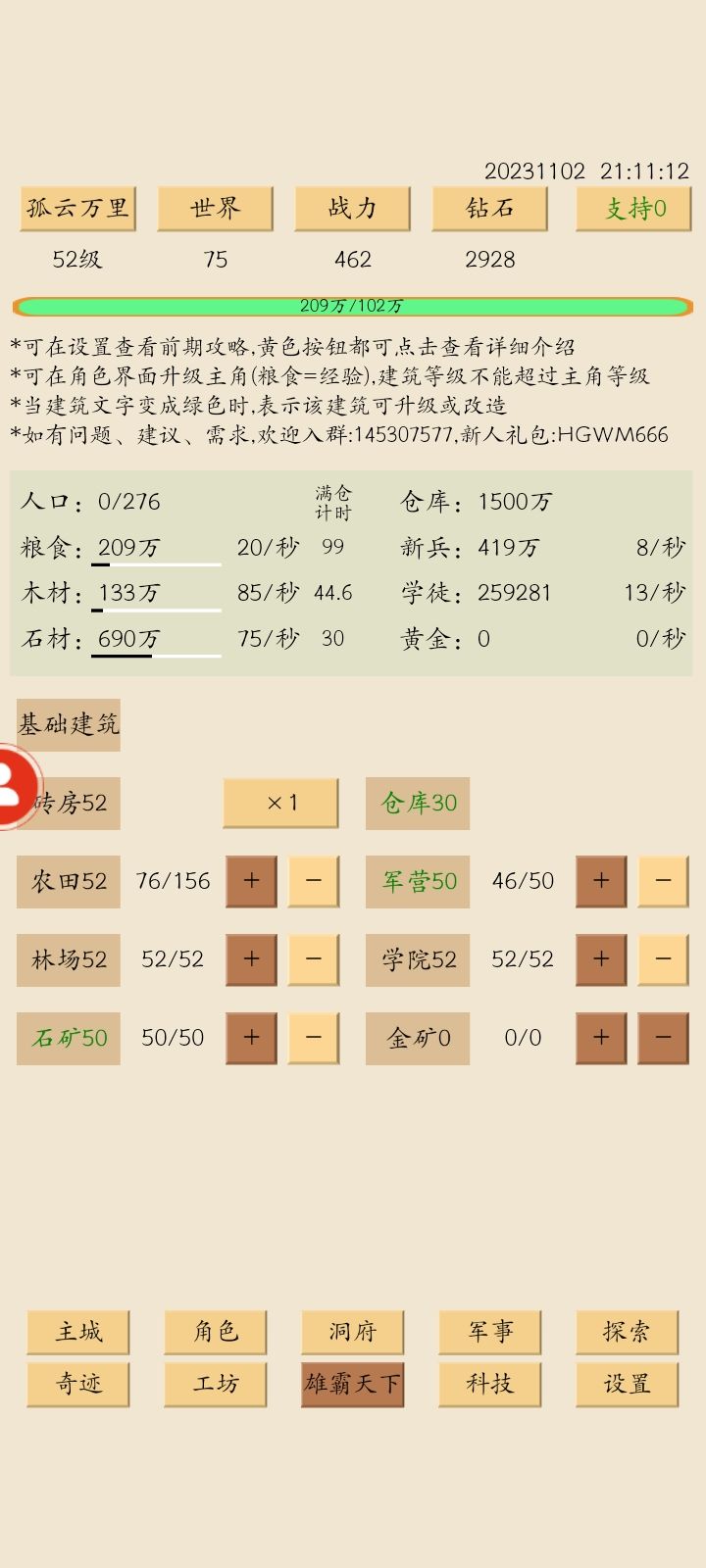 等级推到52,房子、田、木、学院随等级上,产量保持,现在可以打山岭巨人,但要一千多万粮,先不打。科技侧重一点教育,顺天侧重礼部,13学徒了。