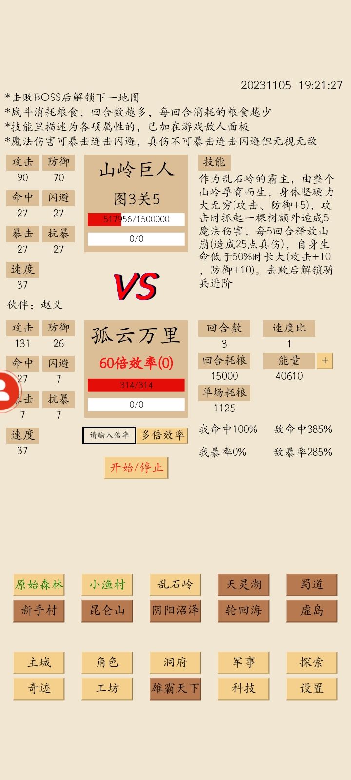 等级依然保持在50级,有粮食清完图二,再打了图三的树精,就可以停止探索一段时间了。石头优先建顺天府,尽快开到礼部,木头建学院,有声望先招赵义+2声望产量,然后出弓兵,禁地能打就打吧。