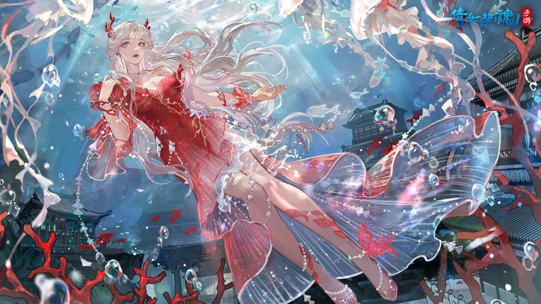 明珠皎皎,玉体芊芊。游鱼相伴,涟漪轻泛。珊瑚神女眼波流转,一袭红裙轻纱飘摇,似锦鲤,如霞光,仙宫珍宝当是如此。