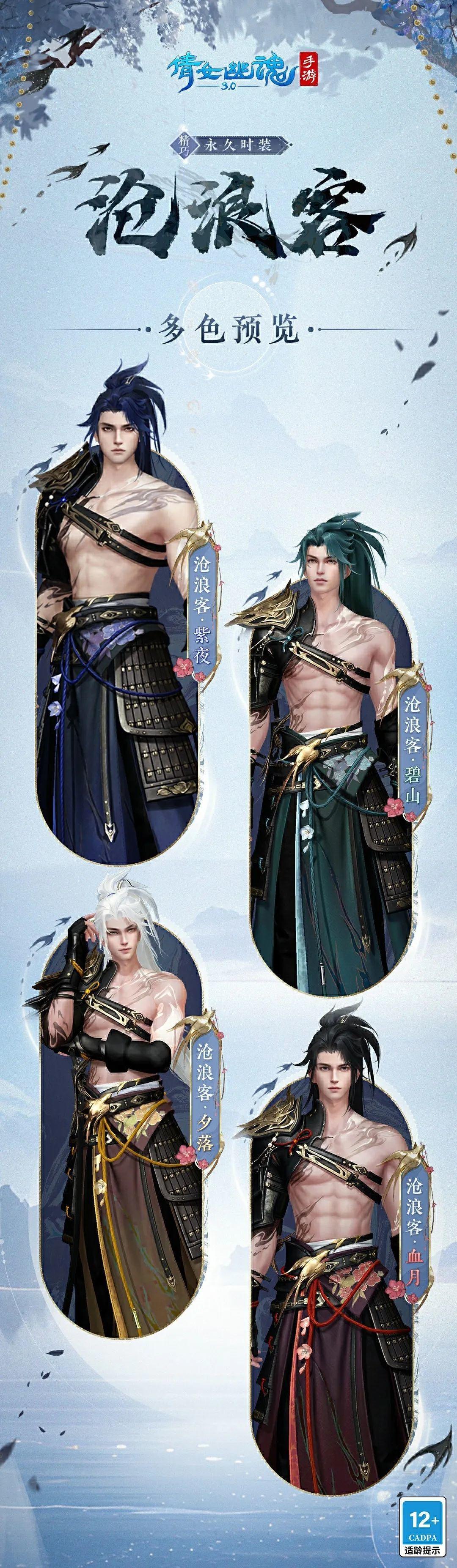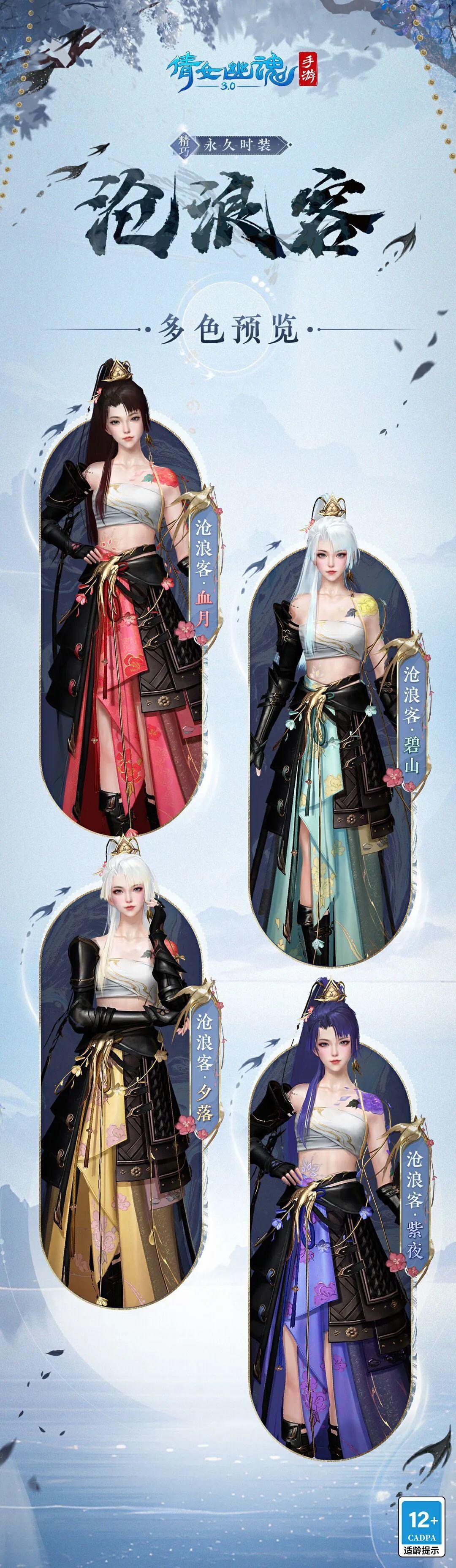 烟波渺,水天青,飒飒秋风生,玄衣侠客携酒一壶,踏浪而行,寄蜉蝣天地,一念随云去。本次时装【沧浪客】有四款,且借秋色几分,枫叶红【血月】款张扬,银杏黄【夕落】款华贵,天青色【碧山】雅致,黛紫色【紫夜】俊逸。