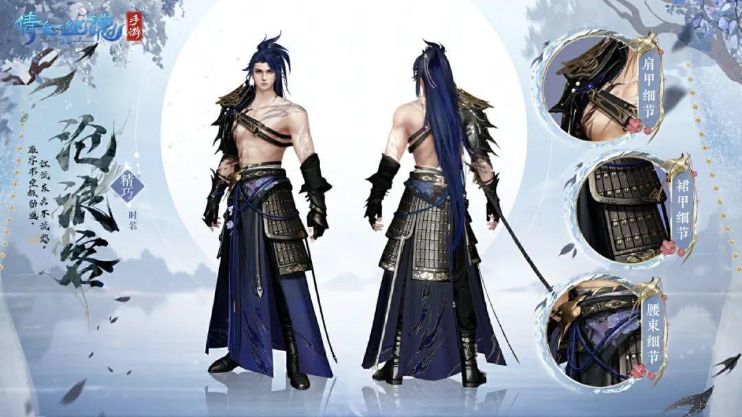铁甲卫三界,玄鳞肃江湖。男款【沧浪客】玄甲金铠,整体采用暗色调,厚重的鎏金肩甲锐意夺目,不拘一格的单侧设计狂放不羁,尽显浪客风范。