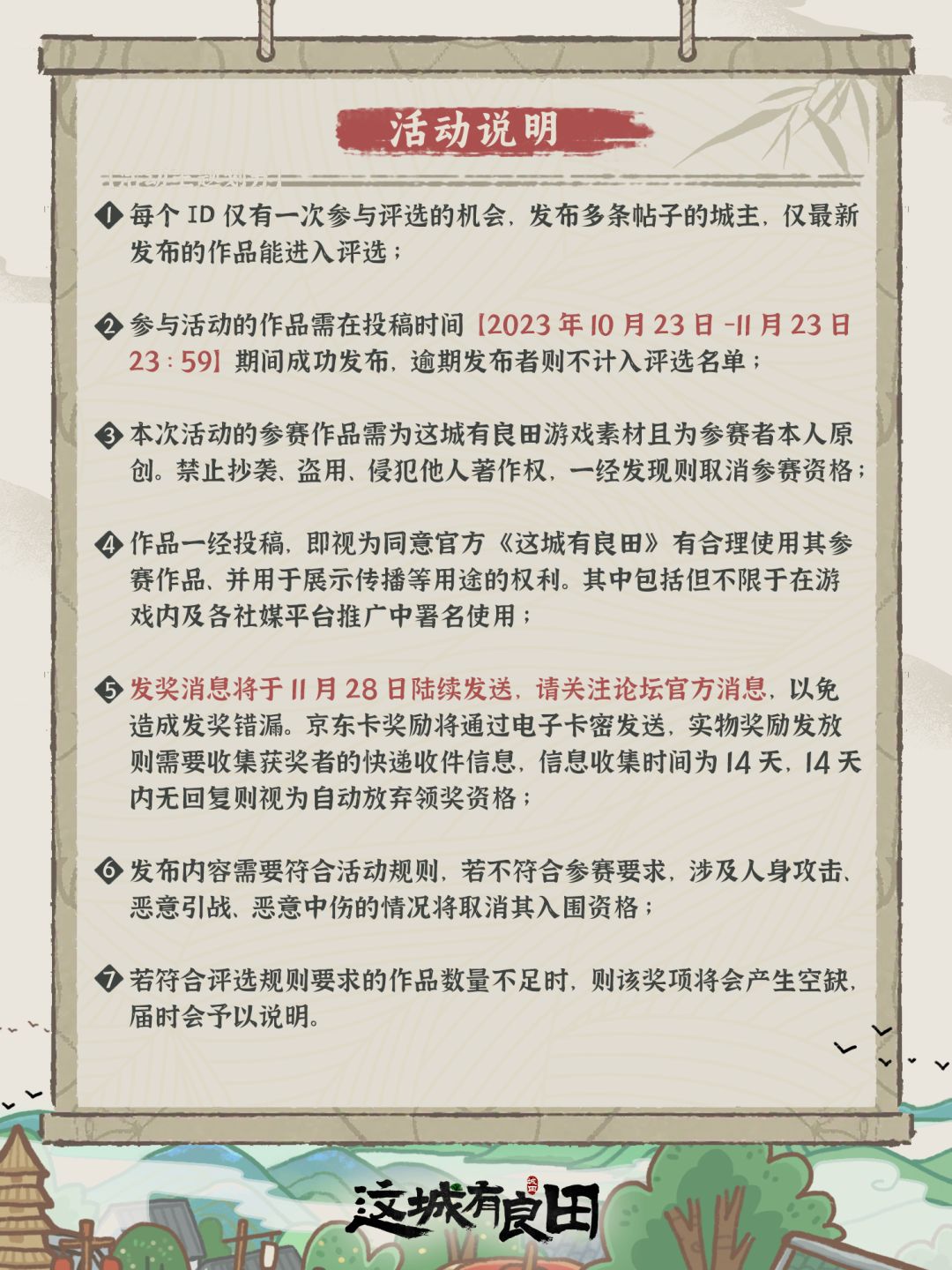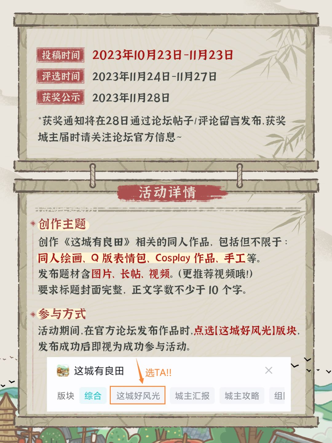 只要将你的作品发布在《这城有良田》TapTap官方论坛的【这城好风光】版块内,按照要求发布成功,即算参与比赛!