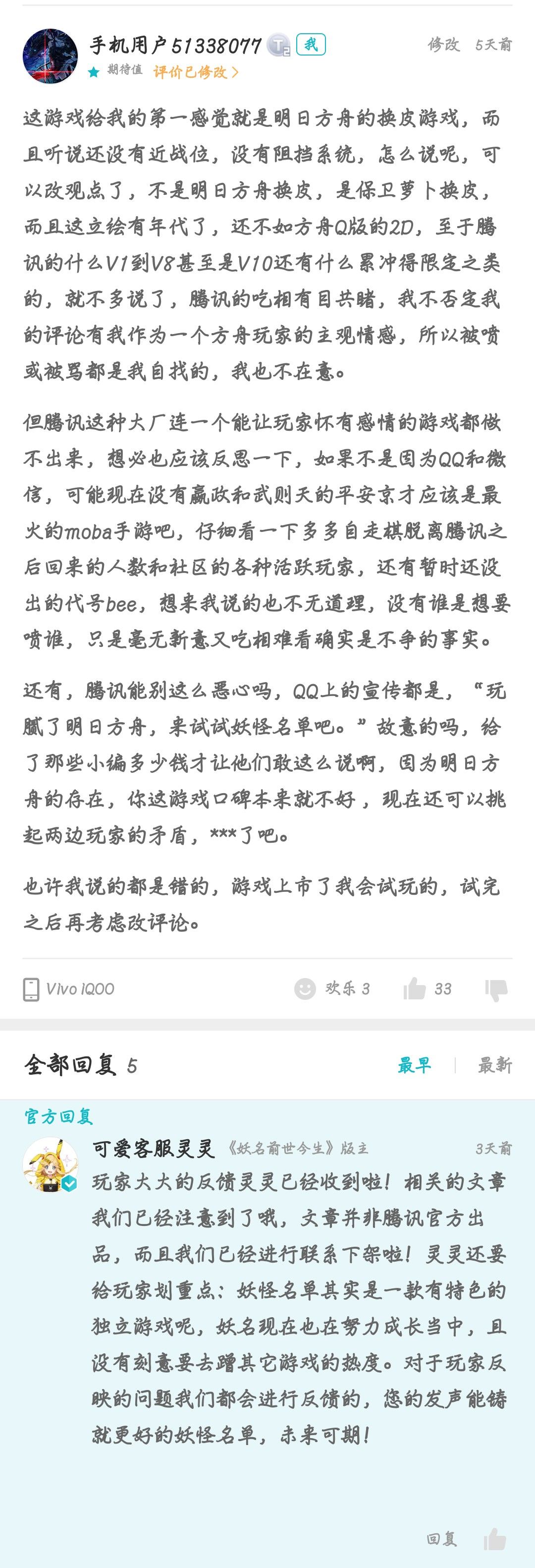 我曾经抱着很客观的态度看待这款游戏,有认真评价,一点点的分析,也很明确的指出过一些东西,客服回复了会处理好,