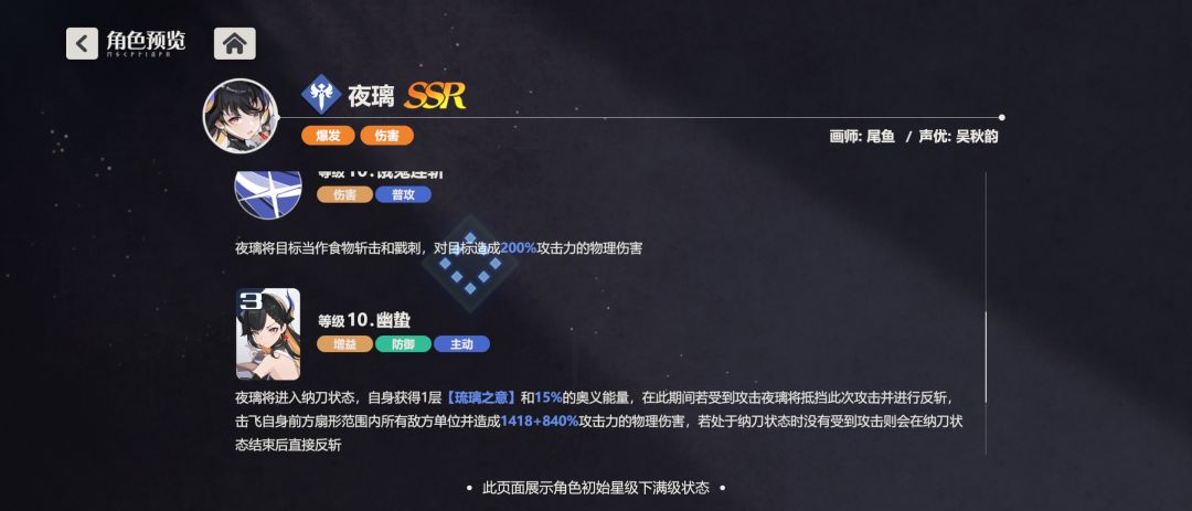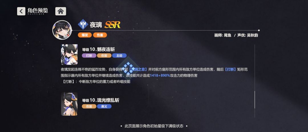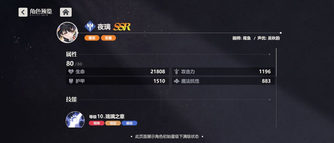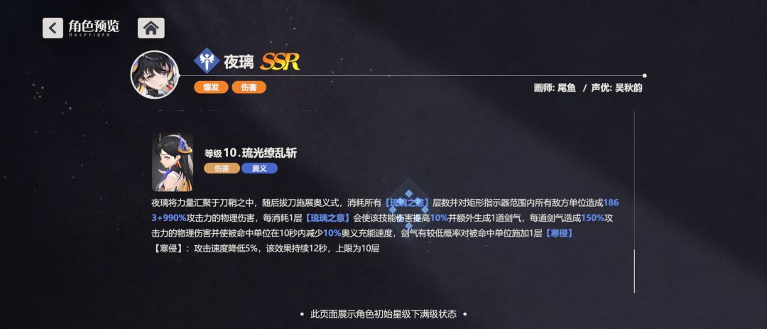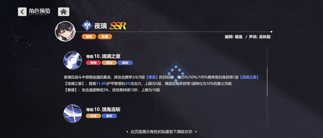 传说有可能是下个限定的水系夜璃,图我放出来,是一个非常吃水体系的大c,由于自身面板不高,输出高低看水系叠寒侵的层数和速度,所以要玩这一只,意味着你必须要有至少四星的丽芙和四星的ssr水盾,外加一个其他远程水输出,所以如果只单up夜璃,没有其他配合,那优先度真的不高,除非也和火鸟一样,两个up池子一个放夜璃和一只sr输出,另一个放水坦,即便如此,你还得歪丽芙,加上开服后大部分人火鸟应该剩不下多少资源,所以,见仁见智了。