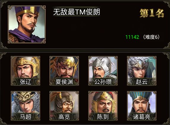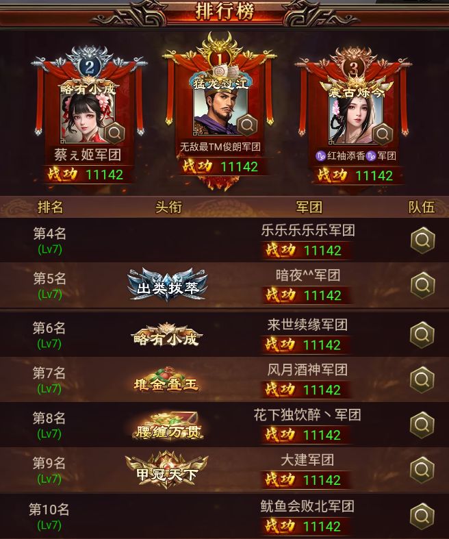 本次合肥之战中排名第一的是 无敌最俊朗 军团,以 11142 的惊人成绩拿下第一。