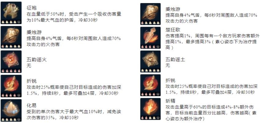 七)元素周天:5个内功20级一共可以拥有25个元素属性,带五韵谣牺牲内功特性多1个元素属性,最多26个。而2个3级周天总共需要24个元素属性,所以我们尽可能通过搭配凑出2个3级周天最大化提升功力,等到后期内功多了再慢慢调整。