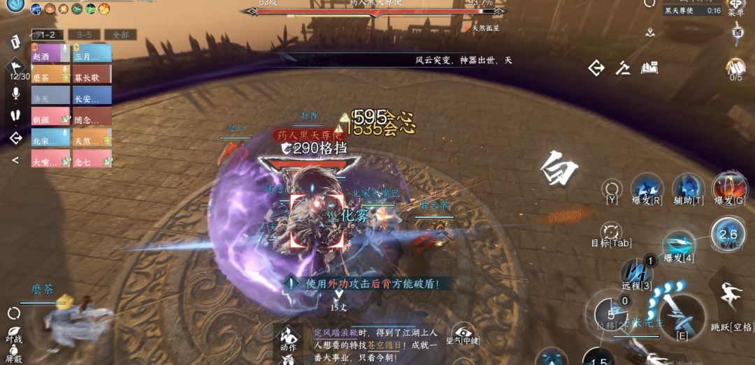 1)黑盾:外功职业在BOSS背后攻击,破盾后BOSS进入短暂虚弱。