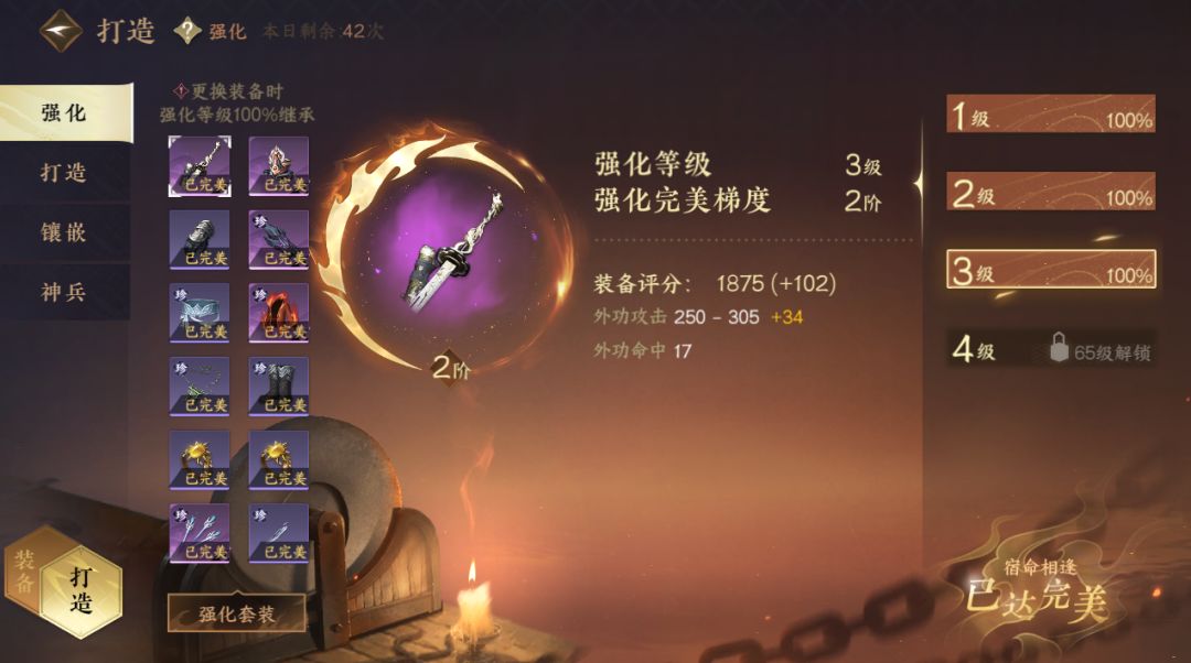 三)强化提升:所有装备今天强化可以达到3级并全部洗到完美。如果解玉砂比较缺,就不要补缀了,只升到3级优先激活套装户型。