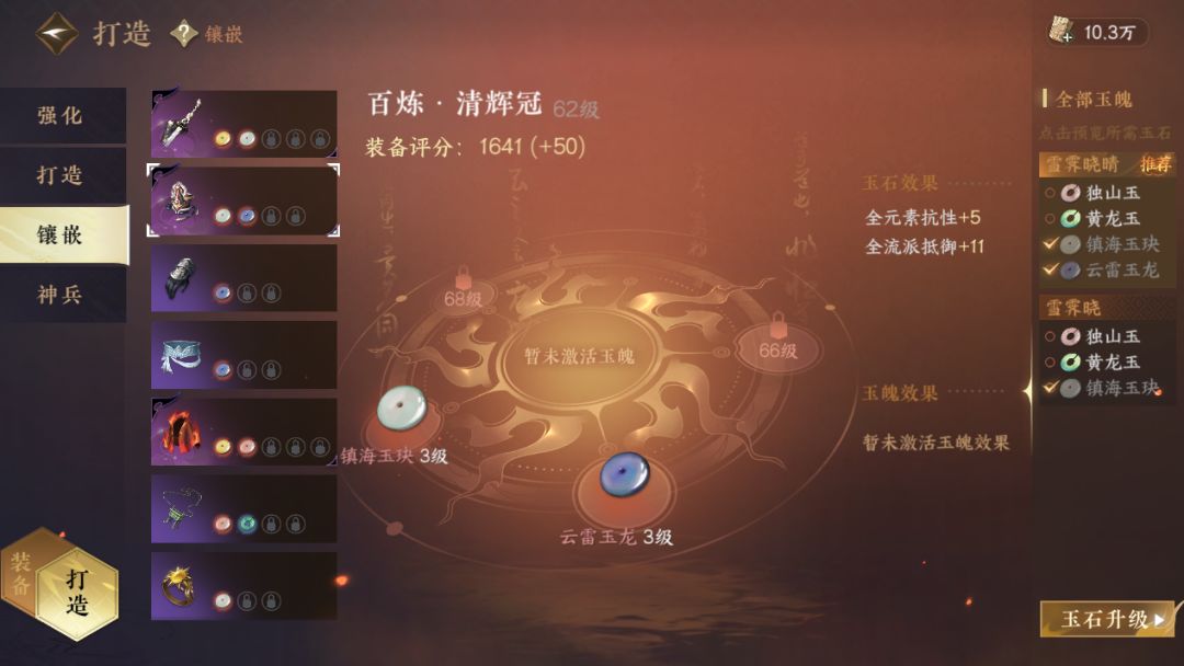 四)宝石镶嵌:开启2个新孔升至3级,头盔:镇海玉玦+云雷玉龙/独山玉(交子不够的话),项链:虎牙玉符,金章玉笏+云雷玉龙/钟山玉(交子不够的话)。
