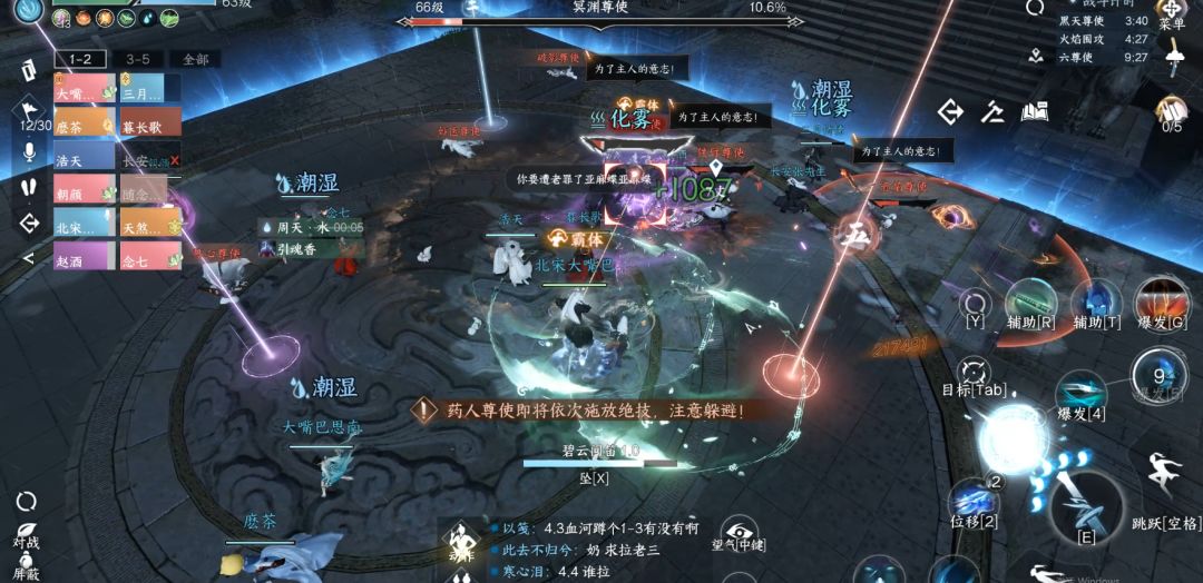 8)狂暴模式:当尊使喊出【为了主人的意志】就表明进入了狂暴模式,伤害大幅提升,此时切莫摊输出等待狂暴结束,特别是别吃九灵的绝技。