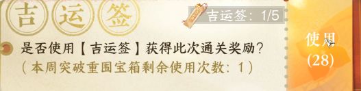 4)打完第一遍舞阳外城1~3以后,就可以再打一遍,使用吉运签获得奖励,推荐找世界上喊【签子】的队伍,这样不会影响其他未通关玩家的团队拍卖奖励。组队的签子依旧可以出横戈以及独珍装备,只是概率有点低。