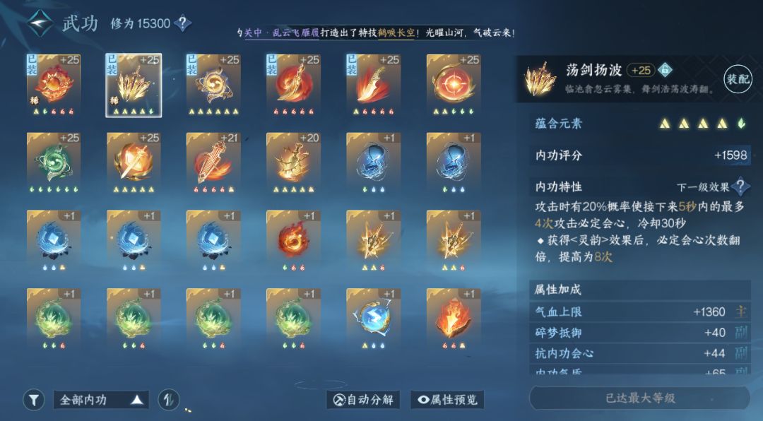六)内功升级:今天内功可提升至25级,25级1500分以上内功为中等,1700以上为优质,呜呜我运气也不行,还有1300不到的25级内功。