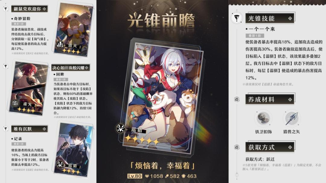 目前来看,对除了托帕之外的巡猎角色来说,都没有抽取光锥「烦恼着,幸福着」的必要,因为目前的几位巡猎角色均以直伤为主,除了彦卿有少部分追加攻击的伤害之外,其余角色和追加攻击完全不挂钩。