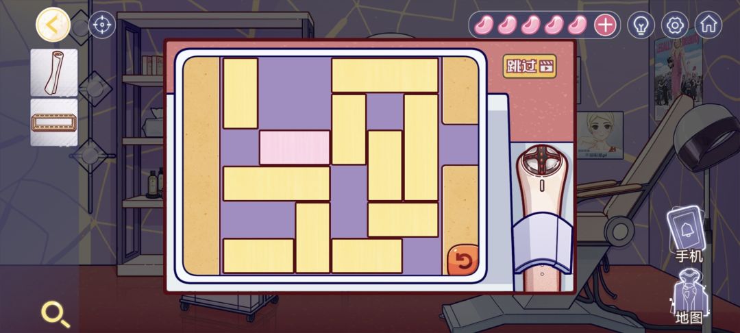 10、右转到美容区。在左侧的架子上第二层发现一排化妆品,但少了一些;下面的移动架子,上面被锁住,需要四位密码,下面有一个美容仪的功能介绍,有五种颜色;梳妆台上得到【试管架】,下面被锁住,需要按顺序输入颜色和数字,右下角提示上下滑动切换颜色,点击切换数字;右上角四个海报都是关于美容仪的功能;点击下面美容仪,需要解开类华容道。这个比较简单,奉上视频。