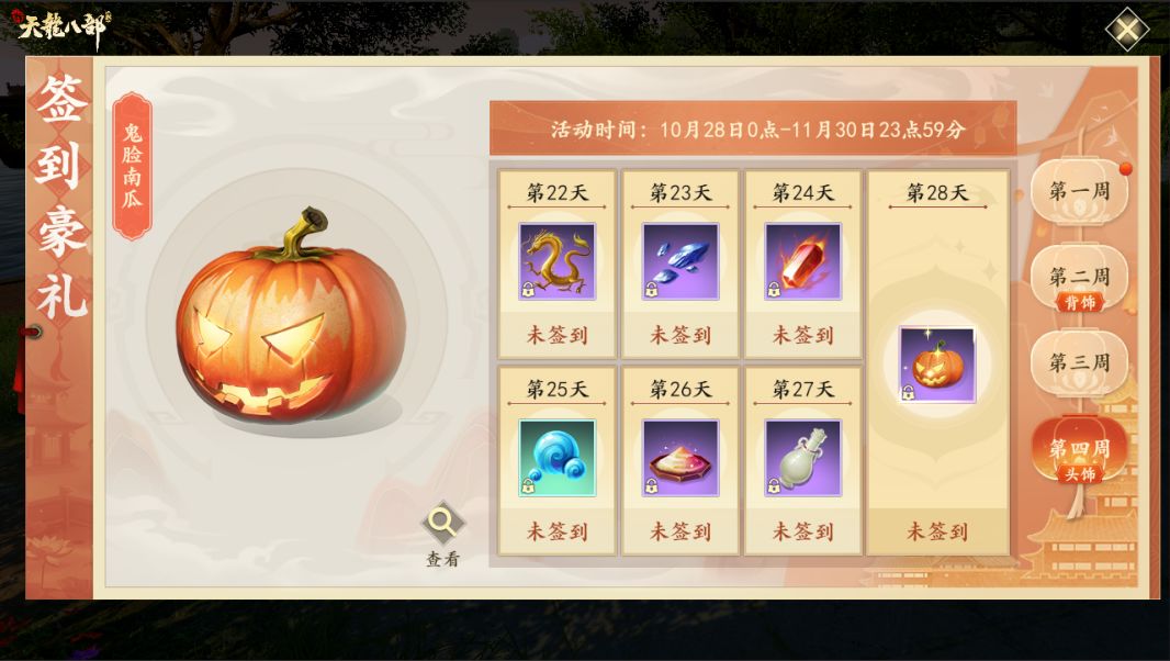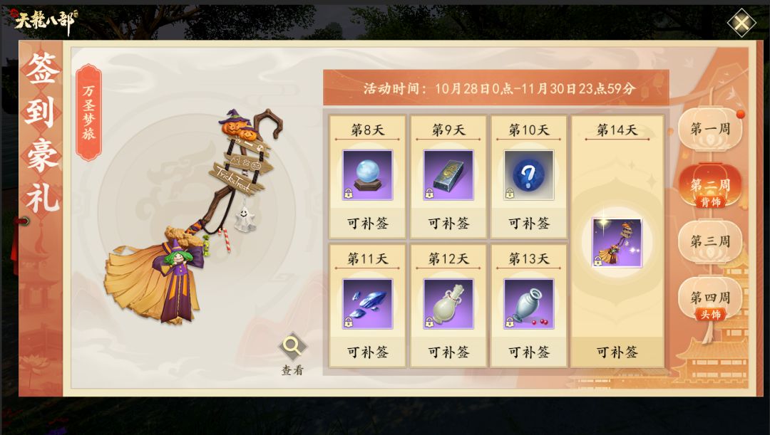 活动开启期间,满足条件的少侠可通过活动界面参与签到豪礼活动,获取“梅花令”、“背饰-万圣梦旅”、“头饰-鬼脸南瓜”等奖励。