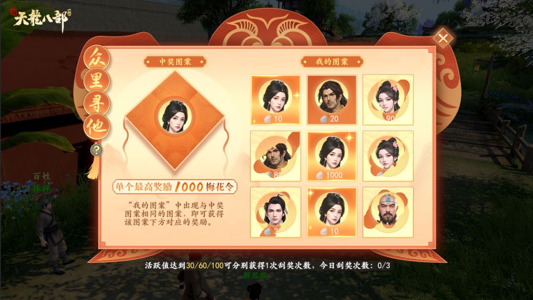 活动开启期间,满足条件的少侠可通过活动界面参与众里寻他活动,获取“梅花令”奖励。