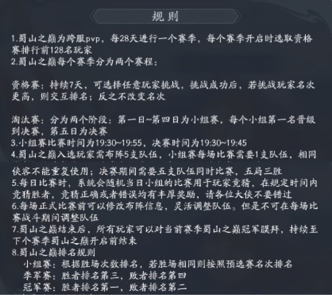 蜀山之巅一共分成两个部分,一个是资格赛、一个是淘汰赛。具体规则如下: