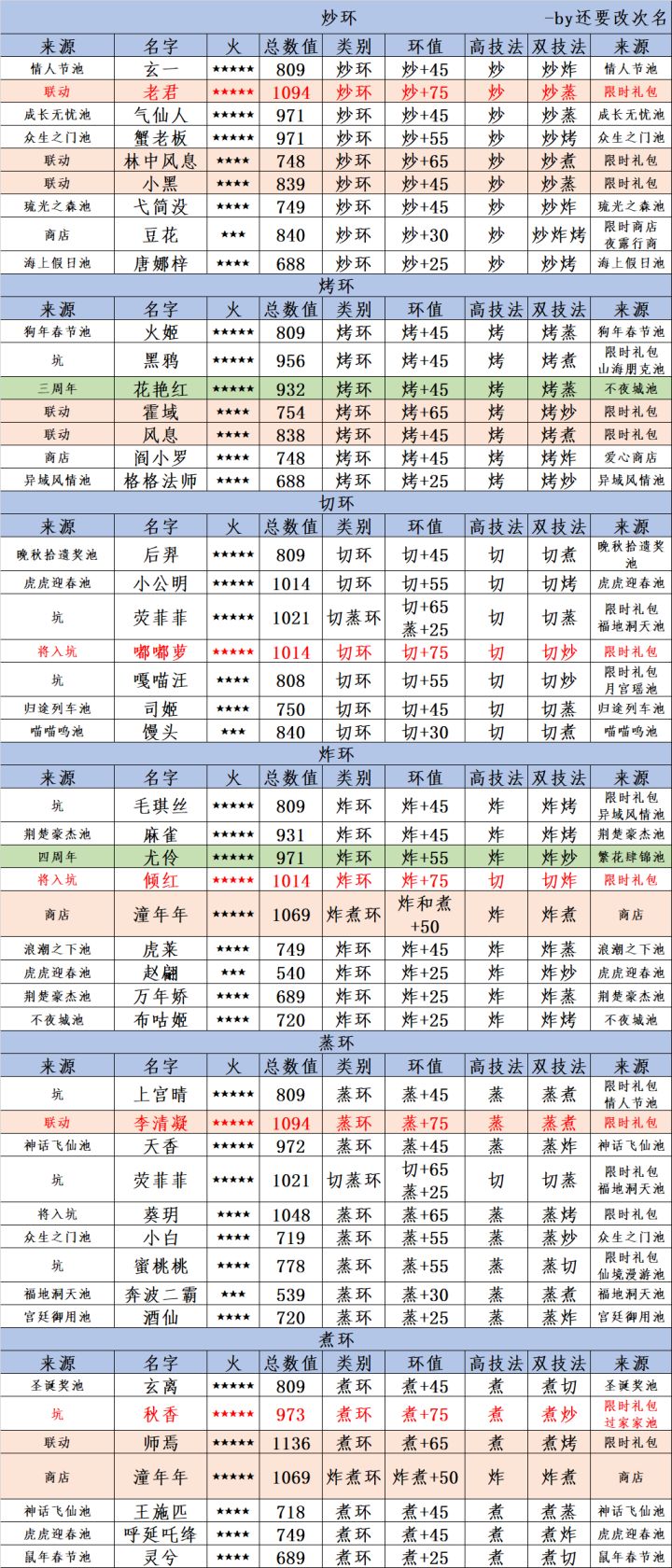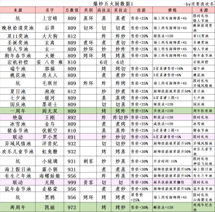 第1张图是所有光环的情况,第2-4张是所有五火厨的(整成一张长图传上来就糊了,所以拆了下),第5张是纯池子给的五火厨,不带坑。