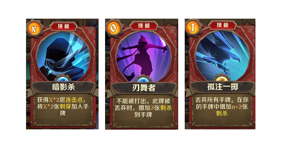 推荐“暗影杀”、“刃舞者”和“孤注一掷”,能提供大量的刺杀牌
