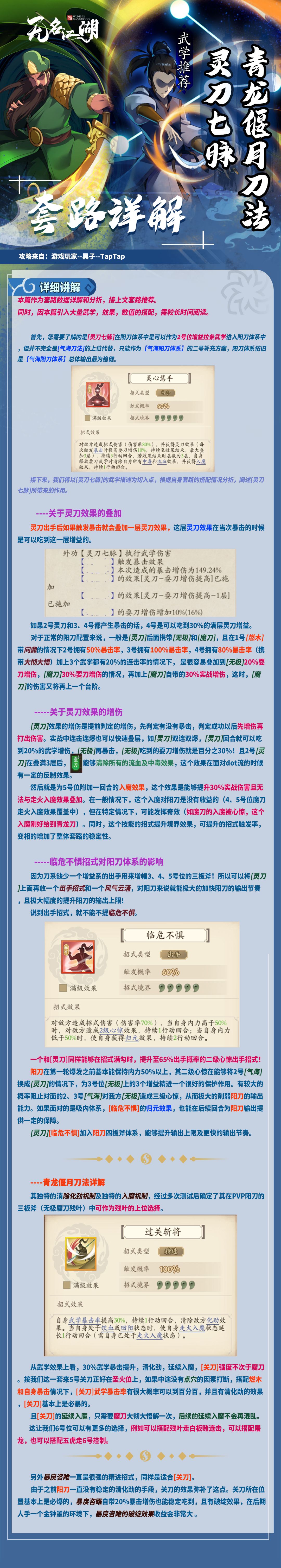 本篇攻略为大家整理了新版本更新后,灵刀七脉与青龙偃月刀法加入阳刀体系的应用及说明。本次分为两张长图,套路推荐与详细讲解,朋友们根据需求查阅即可。武学理解可能存在偏差,欢迎指正和评论区提问。