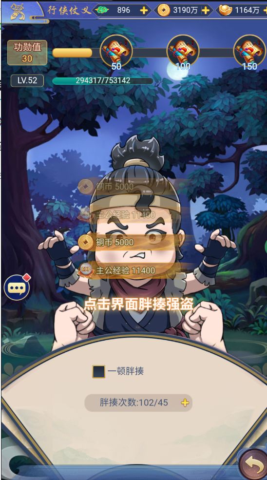 点击界面胖揍强盗,有概率几倍获取铜币和主公经验
