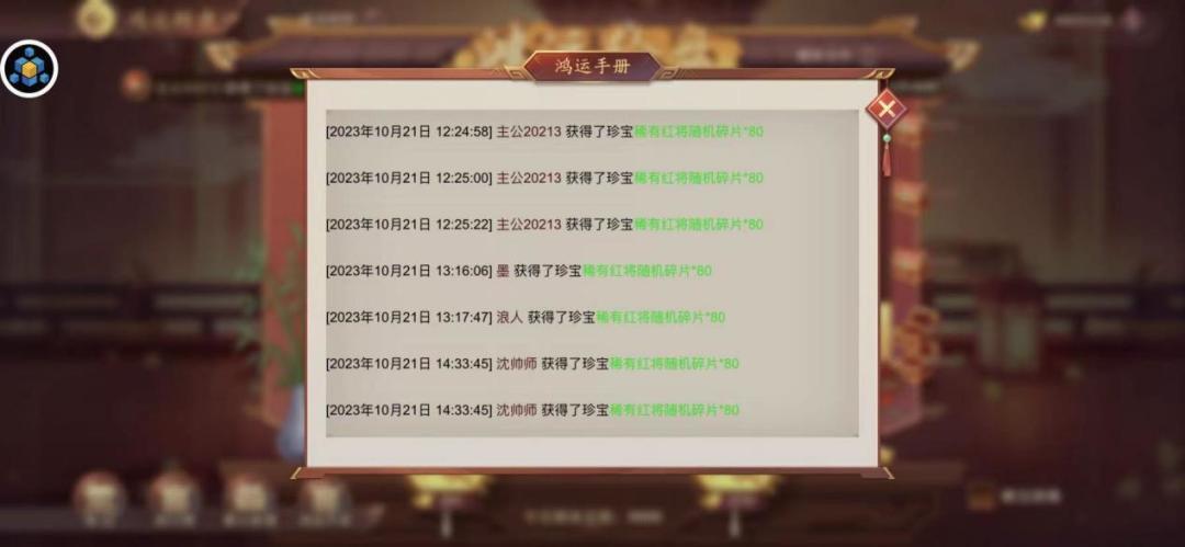 自选奖励有三个选项,分别为:紫色马选择箱*1、紫色书选择箱*1、稀有红将随机碎片*80,目前全服几乎都是选择的稀有红将随机碎片,各位主公可在“鸿运手册”查看获奖公示详情: