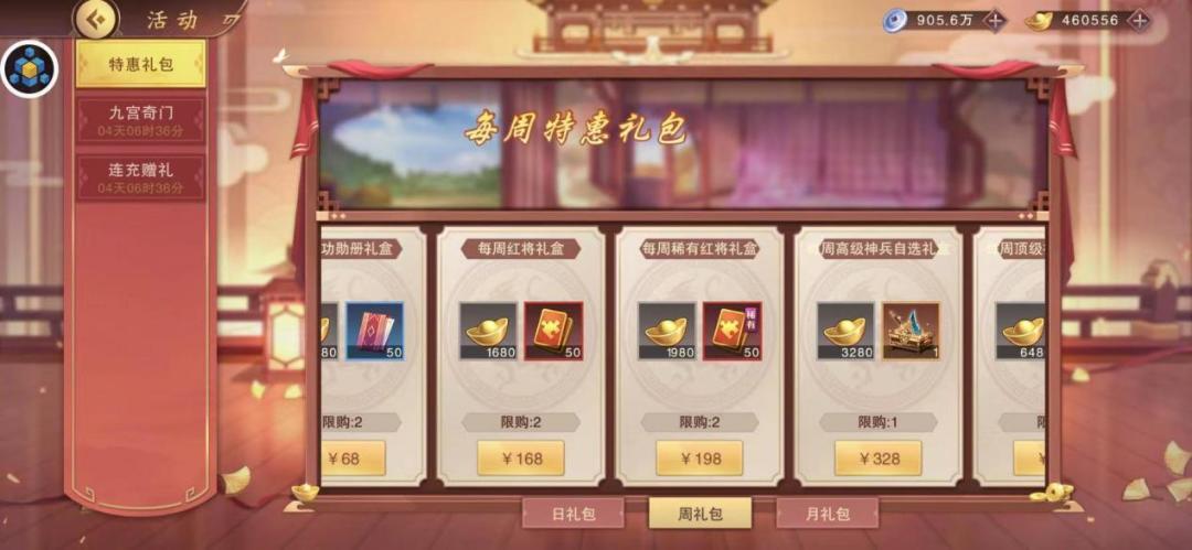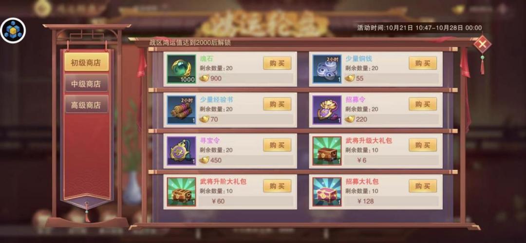 初级商店:战区鸿运值达到2000后解锁,氪金可以考虑128元招募大礼包、6元武将升级大礼包,60元武将升阶大礼包不推荐,普通玩家推荐少量铜钱、少量经验书、,其他不推荐买入,氪佬请随意,高兴就好。