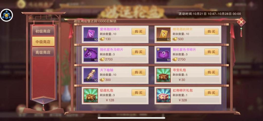 中级商店:战区鸿运值达到10000后解锁,首先所有类型玩家必买满天下卷轴,氪金可以考虑328元红将碎片礼包、寻宝礼包,128元征战礼包不推荐;普通玩家推荐只买入天下卷轴即可,书、马碎片合成为随机,很难合成到自己理想的书马,其他都不推荐买入氪佬请随意,高兴就好。