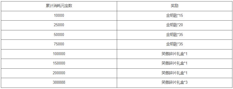 【活动内容】活动期间,累计消耗下方指定元宝数,即可获得奖励!