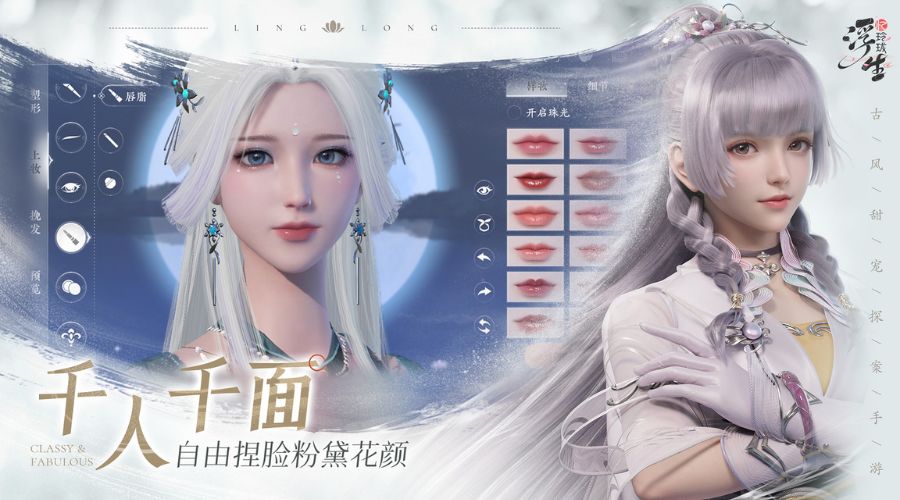 男女双线,自由捏脸。全脸15处细节可上妆,30余款发型,38重维度捏脸,内置全局染发、分层剪发系统,「浮生忆玲珑」为你打造时尚沙龙,1V1定制个性化妆造。
