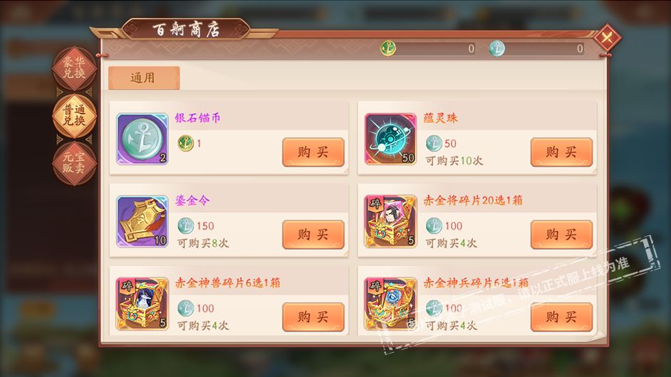 银石锚币可兑换蕴灵珠、鎏金令、赤金将碎片20选1箱、赤金神兽碎片6选1箱、赤金神兵碎片6选1箱、紫金碎片选择箱(六)、紫金装备碎片箱、星宿凝晶、八卦幻紫石、幻紫符选择箱、星魂选择箱、兵书残卷等珍贵道具。