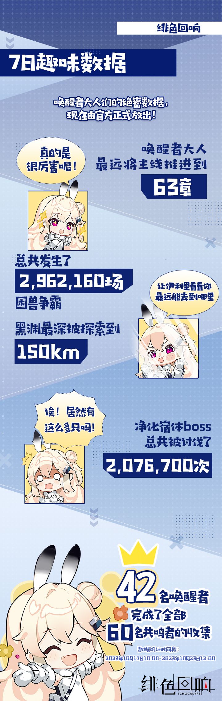 这一周的数据就是这样了哇!唤醒者大人们的努力都刻在了伊利里脑海之中,感谢各位唤醒者大人的努力付出!伊利里也会继续努力来让特赖利克提供更多更完善的服务,让唤醒者大人们都能有更好的体验!那么今天就先这样啦!下次伊利里还会给大家带来更多的作战细节,敬请期待哦~