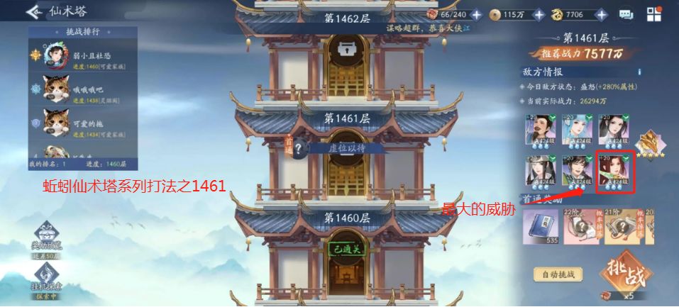 前言:众所周知仙术塔到了1460是自动战斗的终点,1461是群魔乱舞的起点,关卡难度有了质的飞跃,1461后不是简简单单堆积战力就可以通关,而是需要对每一关有深刻的研究,每个侠客特性有一定的了解后,经过长时间的sl才可能通过的,作为一名资深的攻略组成员,蚯蚓决定单独开启该系列的低配打法。该帖不定期更新,更新频率以蚯蚓当前通关的仙术塔进度为准。