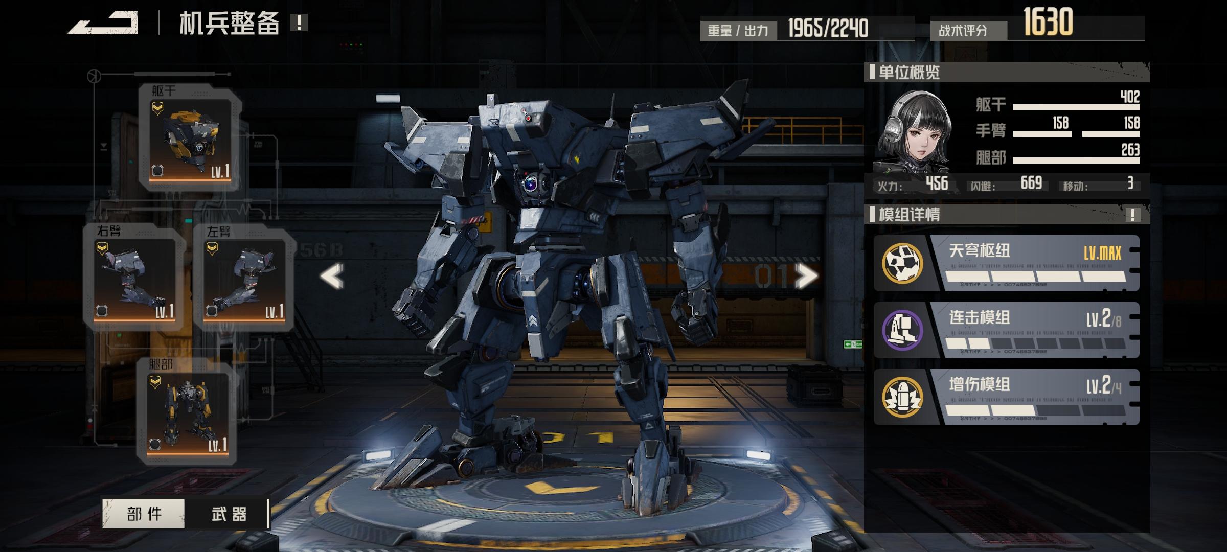 四个部件构成一个机甲,每个部件自带一个天赋,天赋分四个等级。